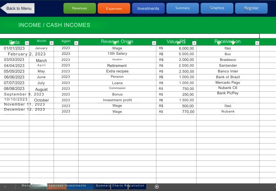 * Você digita seus itens na aba CADASTRO e eles aparecem automaticamente nas abas de Receitas, Despesas e Investimentos para usar e incluir os valores.