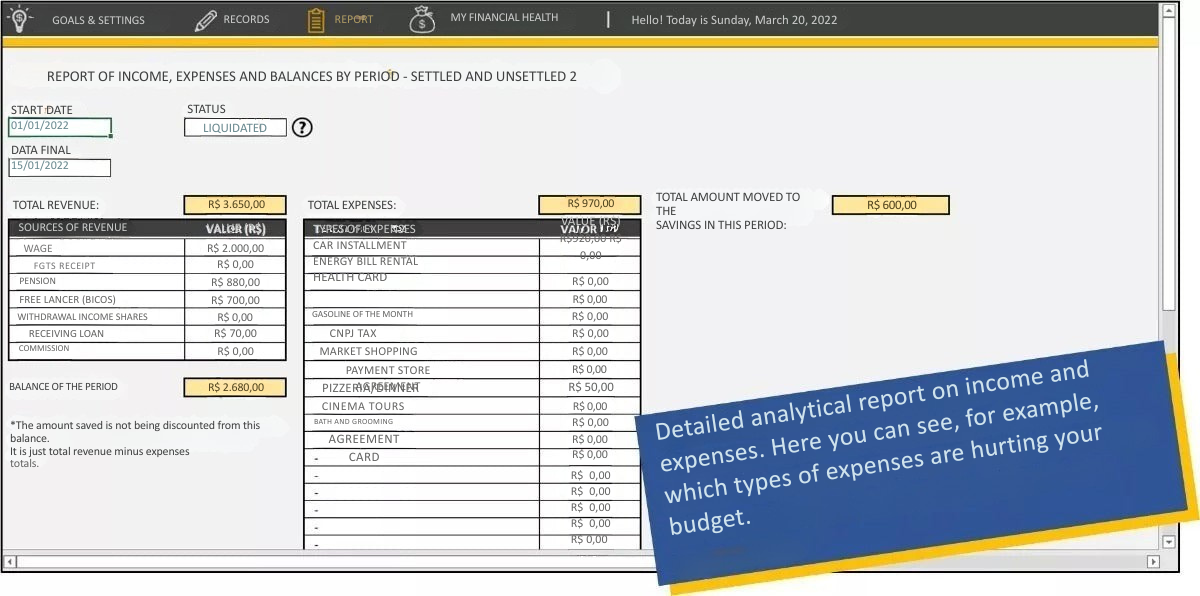 - Analisar relatórios de Receitas ou Gastos por períodos específicos (dia, semana, mês ano, etc.). Você terá a visão tanto do que está programado para receber ou pagar, quando do que já foi liquidado (recebido ou pago!)