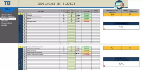 A Planilha de Estudos é destinada a todos aqueles que estão estudando para concurso público, OAB, ou até mesmo na Faculdade e Vestibulares. Tem como benefício um maior controle dos assuntos estudados e revisados, bem como um monitoramento no desempenho do aluno por matéria e por assunto. A Planilha dá ainda sugestões de quanto tempo o aluno deve estudar por semana de acordo com o peso escolhido para cada matéria, além de possuir cronômetro e um lembrete de revisões, deixando o aluno 100% preparado. Há também gráficos de desempenho para os simulados que serão realizados ao longo da preparação para o tão almejado cargo público.