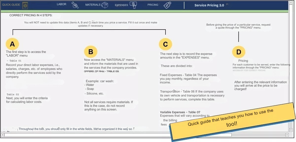 ;2 – A cada serviço que for realizado clique o menu “PRECIFICAÇÃO”, informe o tempo de execução, recursos necessários e margem de lucro que você deseja e locomoção (se houver);