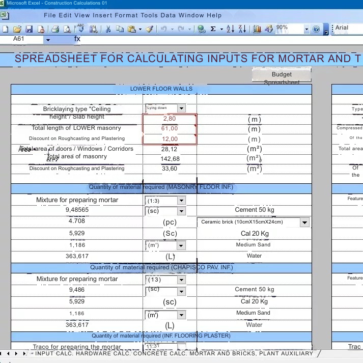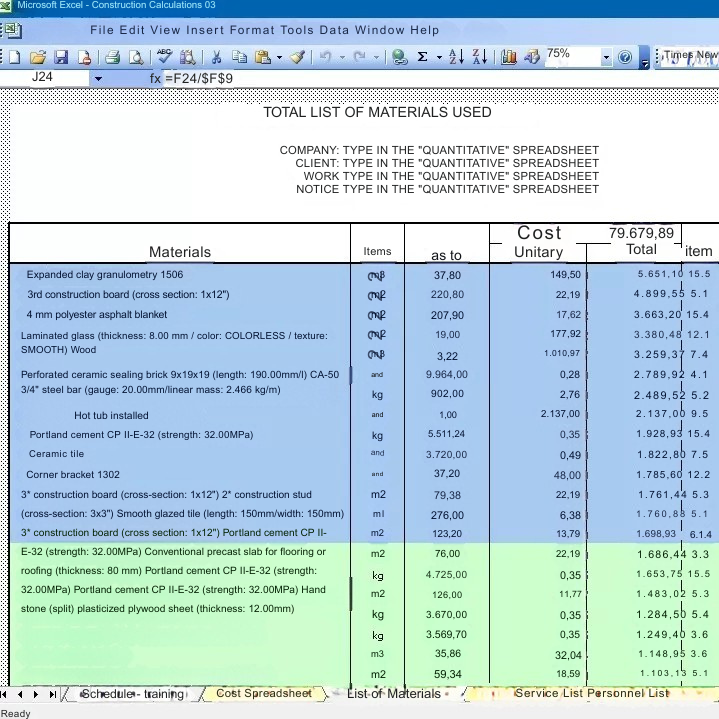 Todo conteúdo é fornecido em 6 planilhas para que os cálculos sejam feitos precisamente. Com elas será possível determinar a necessidade de concreto, ferragens, aço, alvenaria, revestimentos, pisos, serviços técnicos, serviços preliminares, custos de mão-de-obra, pessoal necessário, custos de equipamentos, cronogramas, etc.
