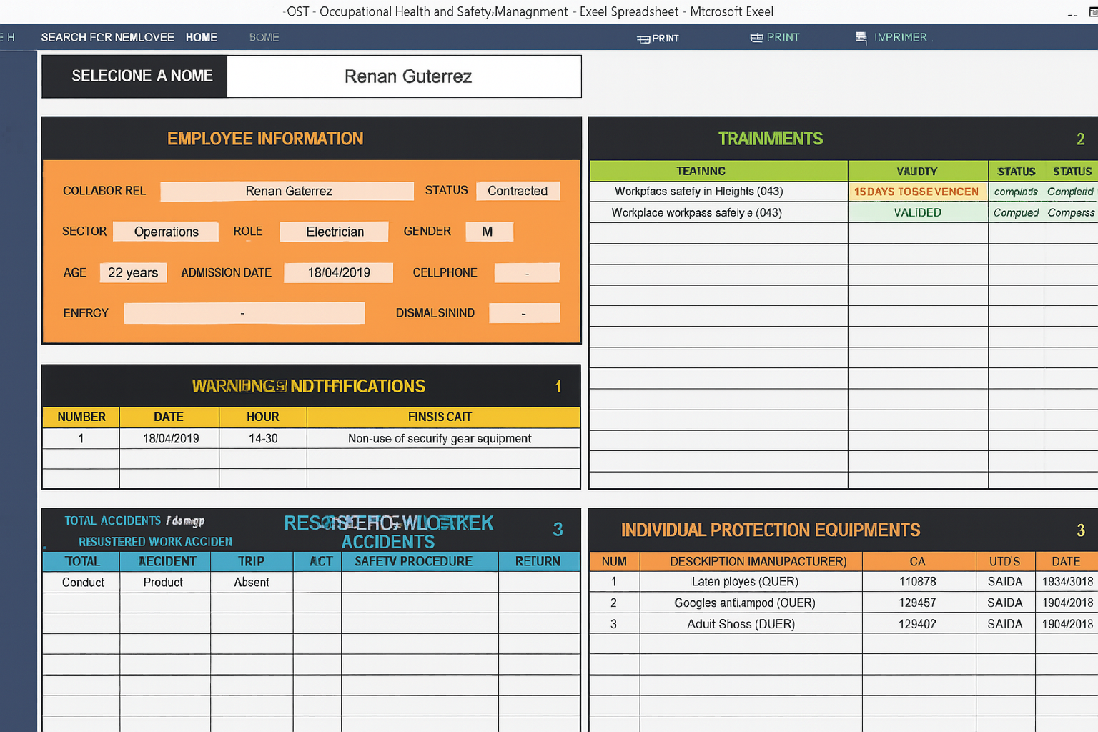 A planilha de Gestão SST conta com um cadastro de colaboradores, com muitos dados e informações. Os colaboradores cadastrados ficarão disponíveis para serem selecionados em outras tabelas da planilha, facilitando e agilizando o processo de preenchimento. Nessa parte também é possível buscar por colaborador (CPF ou RG) e obter informações detalhadas sobre cada um, como acidentes, treinamentos, ASOs, EPIs, riscos entre outros.
