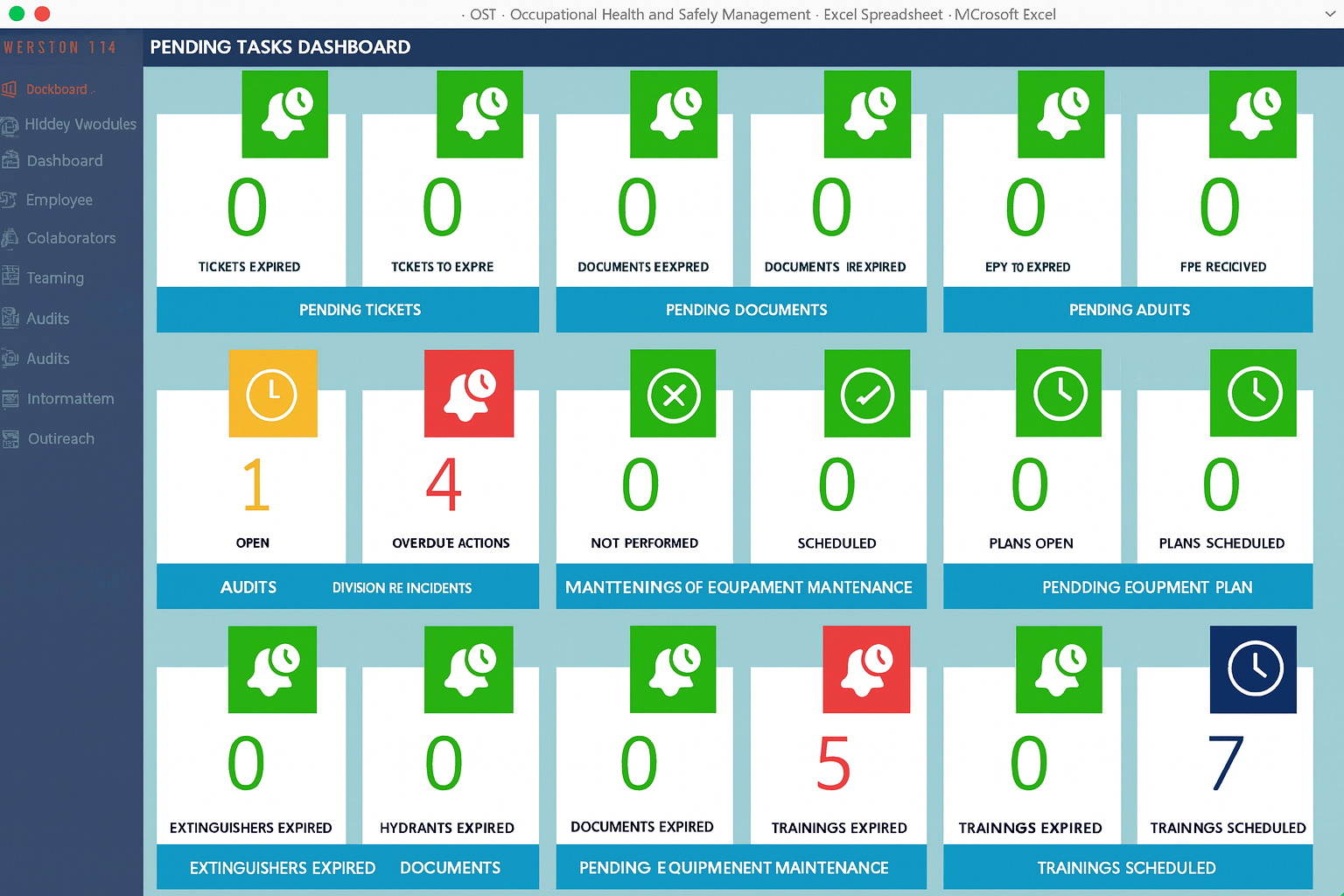 A planilha GSST conta com um total de 9 (nove) dashboards. As seguintes tabelas possuem dashboards: Colaboradores, acidentes, treinamentos, EPIs, extintores/hidrantes, auditorias/desvios, plano de ação e riscos ambientais. A planilha conta com dashboard de pendentes, onde irá mostrar todos os itens que estão pendentes (atrasados, em aberto, agendados).