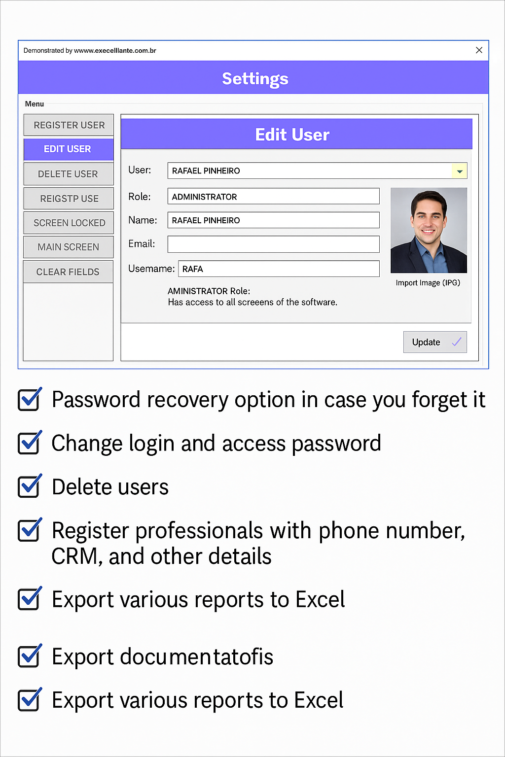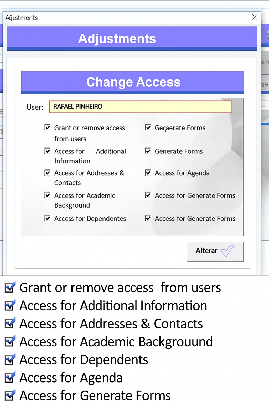 Opção de Ajustes (cadastro, alteração e exclusão de usuários);